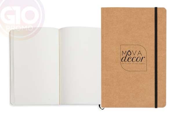 Caderneta em material kraft, frente e verso liso com fita elástica para fechar. Contém aproximadamente 80 folhas marfim sem pauta. Medidas: 13,7cm x 21cm. Personalização na capa em 1 cor já incluso.