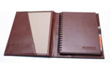 Porta-caderno executivo, Universitário, medidas: 21x28,5cm Conjunto composto por Pasta revestida em couro sintético, contendo bolso interno, porta-cartões, porta-caneta e Caderno com capa dura revestida em couro sintético, com 100 folhas impressas com a logomarca do cliente, gravação em baixo relevo e fechamento com espiral metálico duplo.