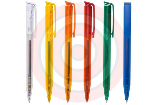 Caneta plástica com carga esferográfica azul 1.0 mm e acionamento por clique. Gravação em 1 cor já incluso.