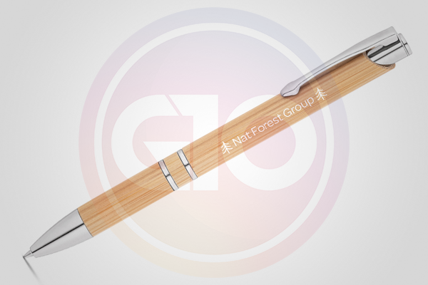 Caneta ecológica de bambu com detalhes de metal.
