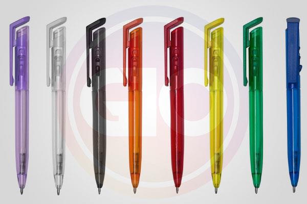 Caneta plástica com suporte para celular, pintura colorida com detalhes em preto. Carga esferográfica azul e acionamento por clique. Gravação em 1 cor já i...