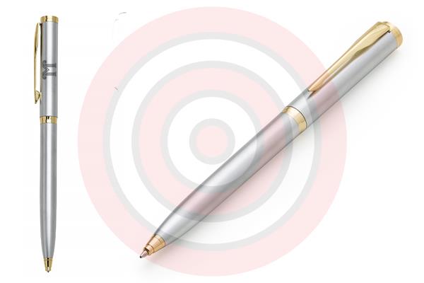Caneta de metal, prata com detalhes dourados. tamanho: 13,3 cm x 3,5 cm - uma gravação já inclusa.