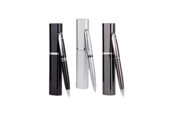 Caneta de metal com estojo, disponíveis nas cores prata, preto, cinza, cromo e branca - com uma gravação já inclusa.