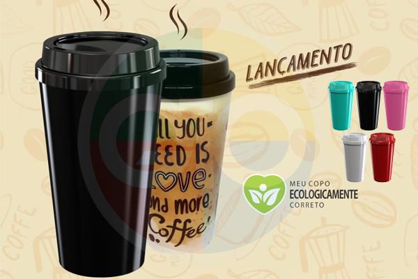 Copo para café personalizado, copo plástico com capacidade de 350ml, tampa com bocal. Personalização em 1 cor já incluso.