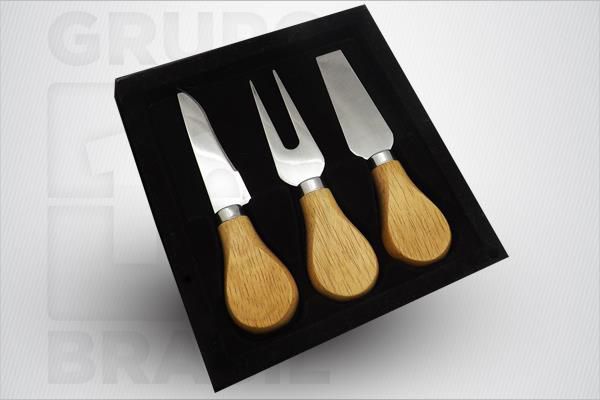 Kit para queijo com 3 peças, em estojo de papelão resistente com tampa de plástico. Medidas do Produto (CxL): 12,0 cm x 3,0 cm Medidas da Embalagem (CxL): ...