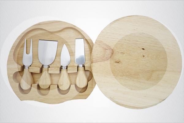 Kit queijo com 5 peças, base de madeira. Uma gravação já inclusa.